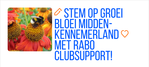 ![]() Stem op onsSeptember is de maand van de Rabobankclubsupport. Heb je een rekening bij de Rabobank of ken je iemand die dat heeft, breng dan 1 stem op ons uit: Groei & Bloei Midden-Kennemerland. Hoe meer stemmen, hoe hoger het bedrag dat de Rabobank ons toekent. Net als andere jaren zal dit bedrag aan vergroeningsprojecten worden besteed.https://www.rabobank.nl/leden/clubsupport
